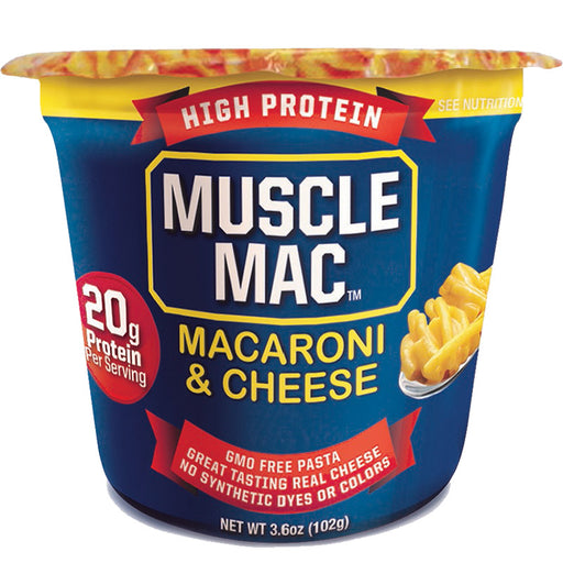 Muscle MacMUSCLE MAC™ MACARONI & CHEESE, CONVENIENT MICROWAVABLE CUPS Same great flavor in half the time GMO free pasta and Real Cheese No synthetic dye...